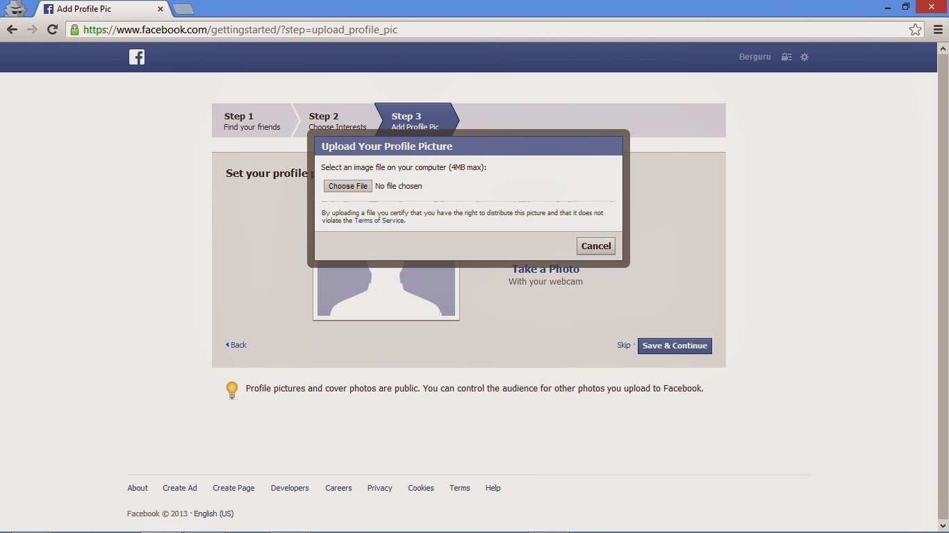 Bisa dibilang inilah tahap terpenting dari membuat Akun Facebook, yaitu mengunggah atau me-upload Foto Profil, karena disinilah orang akan menilai bagaimana kepribadian Anda. Jadi berikan Foto Terbaik Anda.